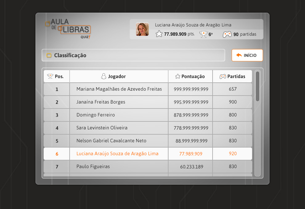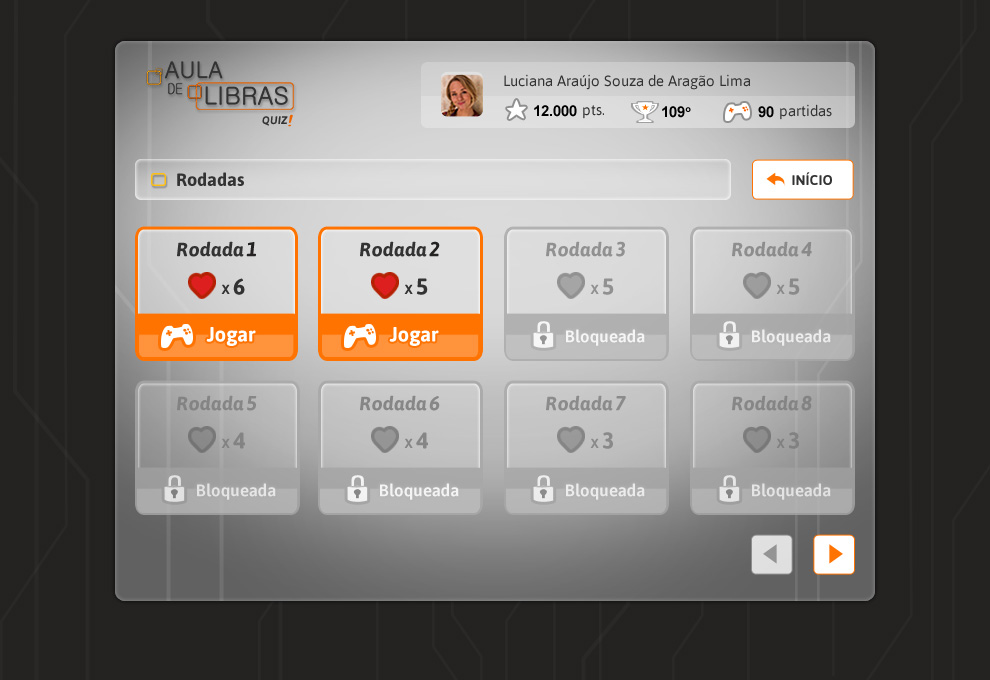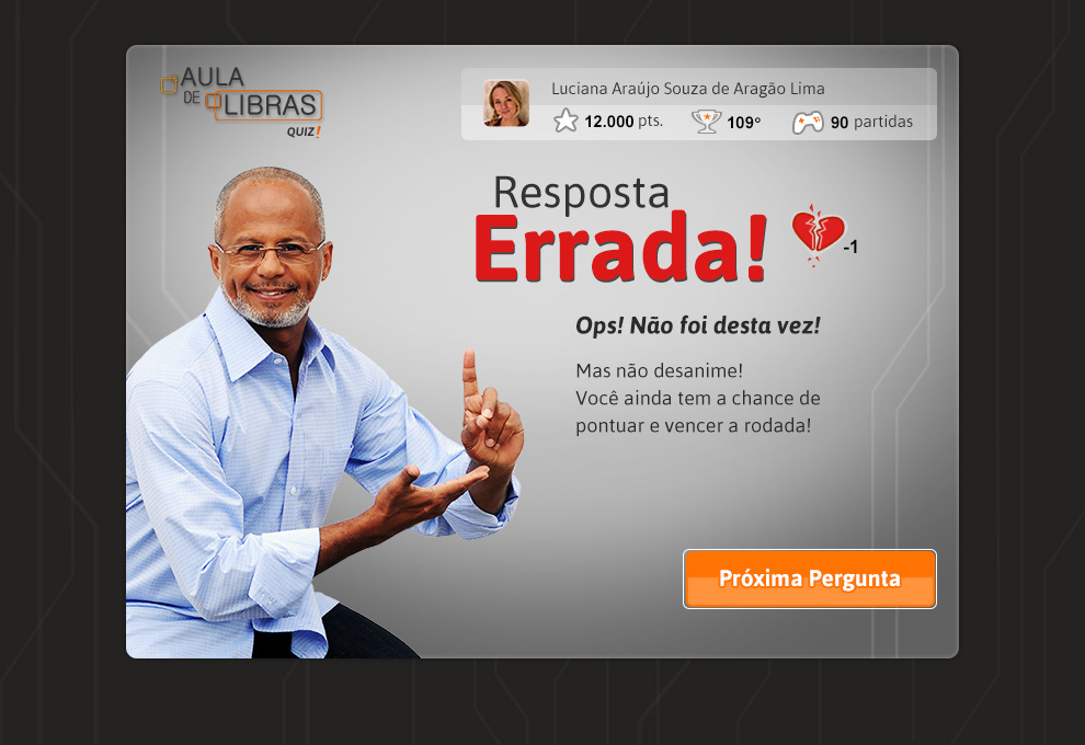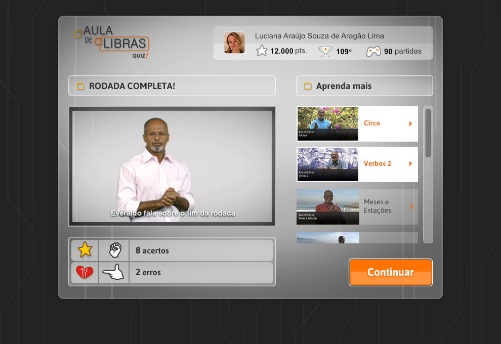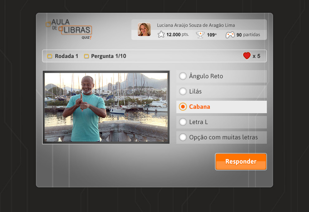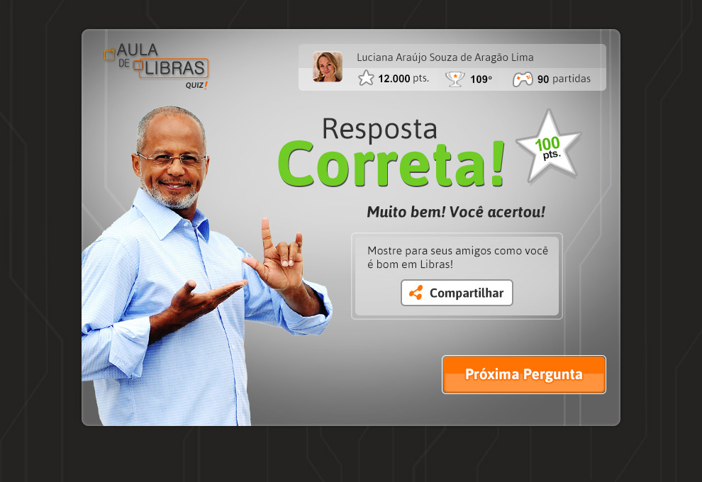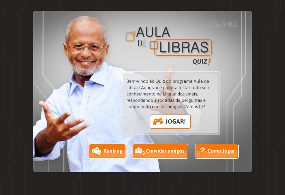 Based on the TV Show with the same name, the idea behind Aula de Libras Quiz was to teach Brazilian sign language - LIBRAS - to the general audience, while also teaching written Portuguese to people who only communicate through sign language. To reach this goal, TV INES enlisted the TV show's host, Heveraldo Ferreira, to record lots of short videos where a word would be gesticulated in LIBRAS, so that players had to guess its translation to Portuguese.