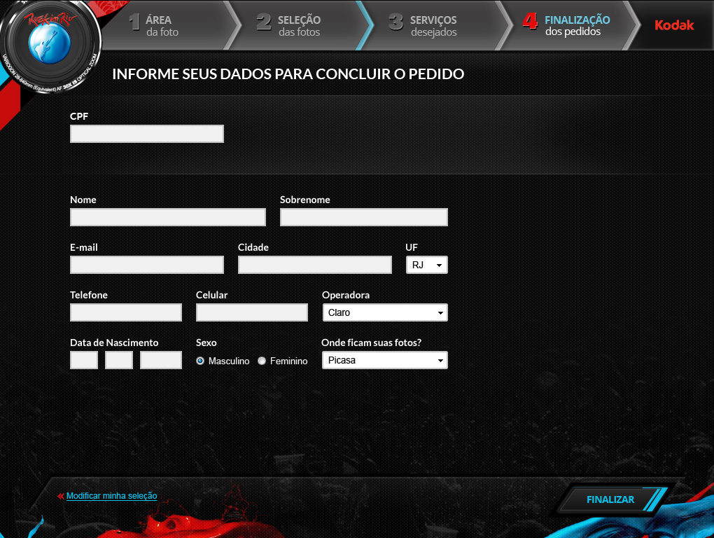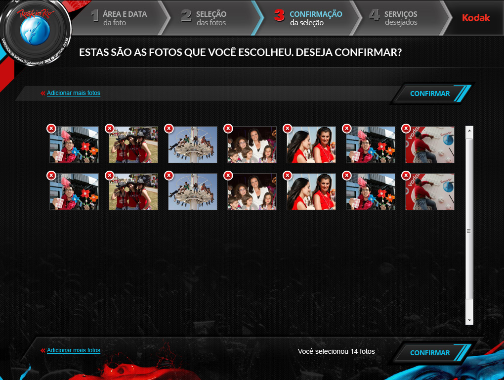 In the 2011 version of the famous Rock in Rio event, Kodak partnered with Imprimir Soluções to offer event participants a photo kiosk where they could print their Rock in Rio photos right there, in the middle of the action. Imprimir, a former employer, then reached out for my help, asking me to design the app's UI/UX , as well implementing the front-end in HTML/CSS.